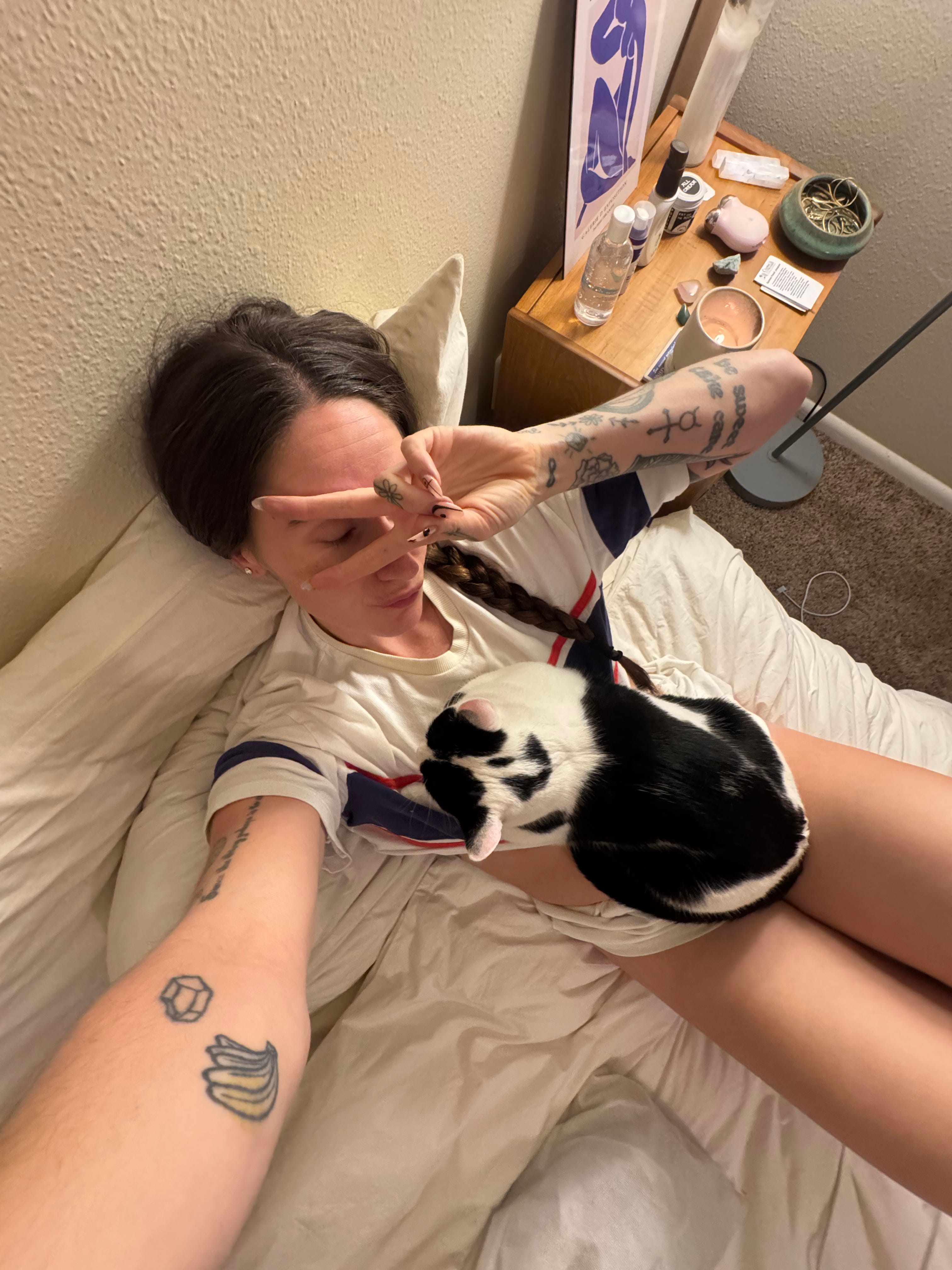after a still inexplicable and unexpected run to the ER and subsequently the vet, many resented medication administrations and a LOT of sleep, Cowgirl is fully mended and back to her prancing, playful, cuddly self. I feel tremendously grateful for all the love people showed her and me; she is my daughter and familiar and my dear friend. i am proud of how i cared for her and so grateful that i was able to.
